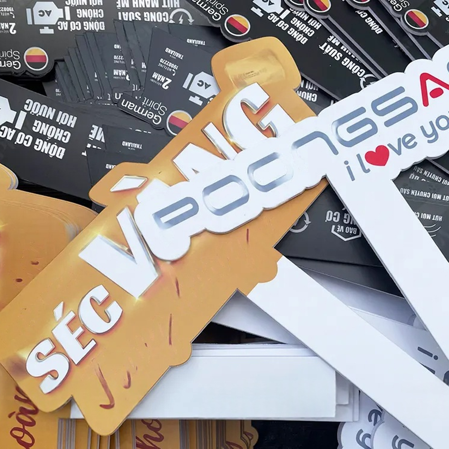 Hashtag cầm tay & Standee mô hình: Sử dụng Fomex cắt CNC theo hình dáng sản phẩm để làm công cụ quảng cáo tại sự kiện.